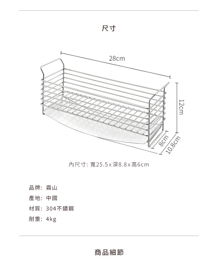尺寸:寬28×深10.8×高12cm、[內尺寸]寬25.5×深8.8×高6cm 材質:304不鏽鋼 耐重:4kg 產地:中國 ※尺寸皆為人工測量,誤差±0.2cm屬正常範圍。 |購買注意|