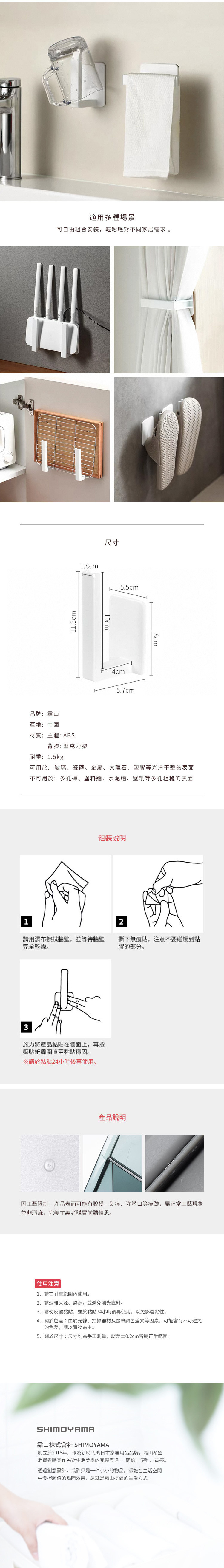 尺寸:寬5.5×深5.7×高11.3cm 材質:[主體]ABS、[背膠]壓克力膠 耐重:1.5kg 產地:中國 ※尺寸皆為人工測量,誤差±2cm屬正常範圍。