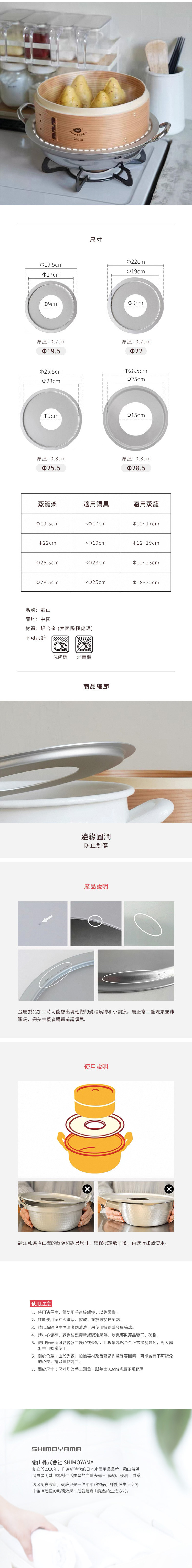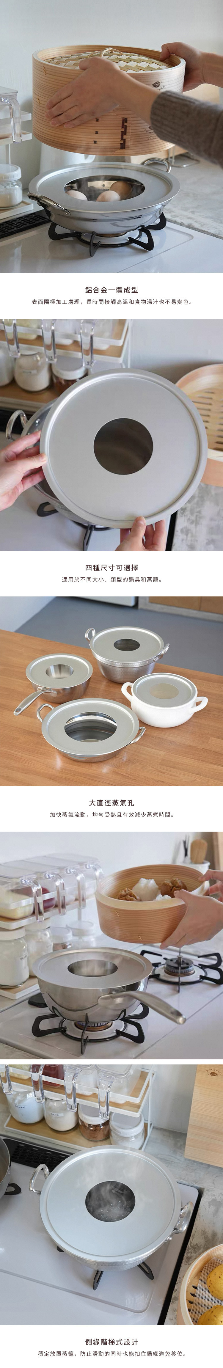 尺寸:直徑19.5×厚0.7cm、[蒸氣孔]直徑9cm 材質:鋁合金(表面陽極處理) 適用於:小於Φ17cm鍋具、Φ12~17cm蒸籠 不適用於:洗碗機、消毒櫃 產地:中國 ※尺寸皆為人工測量,誤差±0.2cm屬正常範圍。