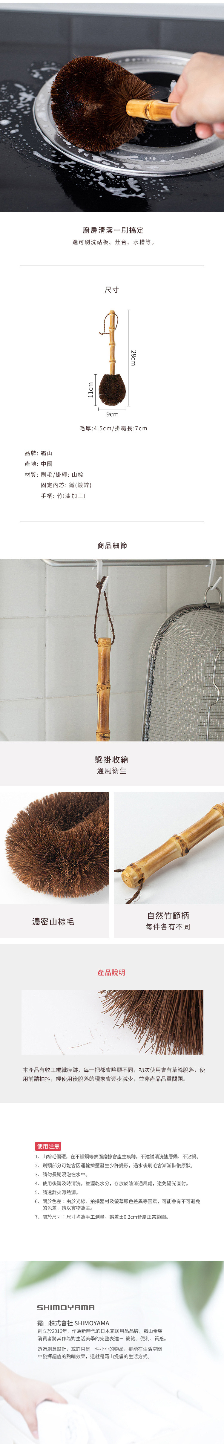 尺寸:長9×高28cm、[刷頭]高11cm、[刷毛]厚4.5cm、[掛繩]長7cm 材質:[刷毛/掛繩]山棕、[固定內芯]鐵(鍍鋅)、[手柄]竹(漆加工) 產地:中國 ※尺寸皆為人工測量,誤差±0.2cm屬正常範圍。