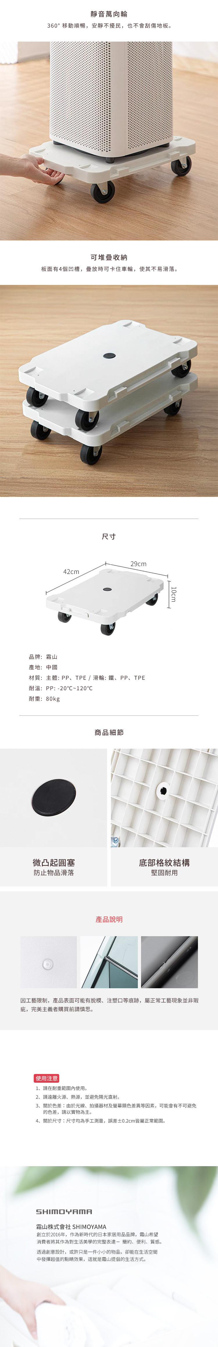 尺寸:長42×寬29×高10cm 材質:[主體]PP、TPE、[滑輪]鐵、PP、TPE 耐溫:[PP]-20℃~120℃ 耐重:80kg 產地:中國 ※尺寸皆為人工測量,誤差±0.2cm屬正常範圍。