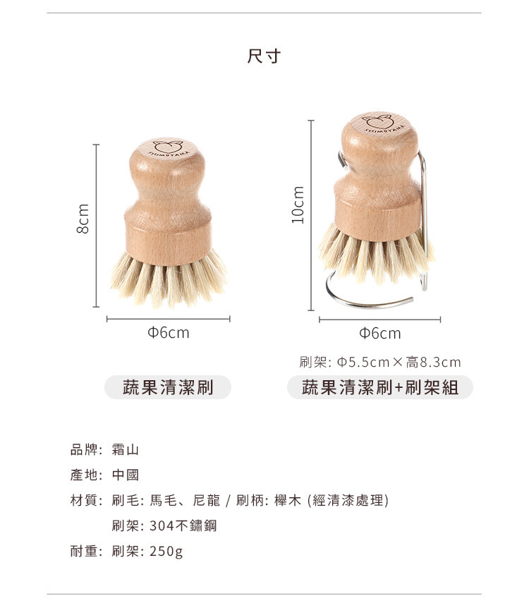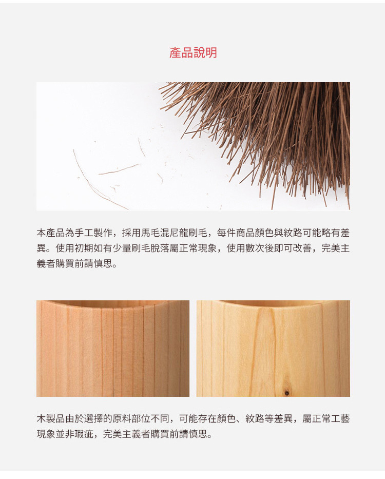 尺寸:[刷具]直徑6×高8cm、[刷架]直徑5.5×高8.3cm 材質:[刷毛]馬毛、尼龍、[刷柄]櫸木(經清漆處理)、[刷架]304不鏽鋼 耐重:[刷架]250g 產地:中國 ※尺寸皆為人工測量,誤差±0.2cm屬正常範圍。