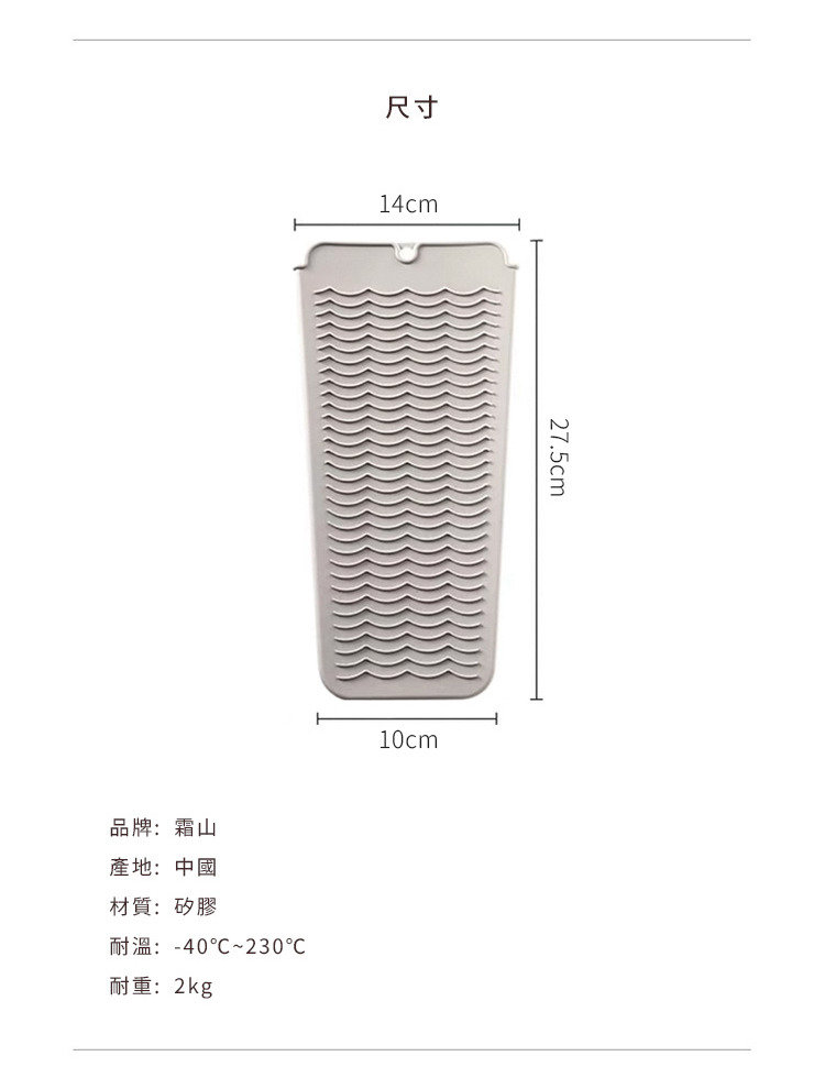 尺寸:寬14×高27.5cm 材質:矽膠 耐溫:-40℃~230℃ 耐重:2kg 產地:中國 ※尺寸皆為人工測量,誤差±0.2cm屬正常範圍。