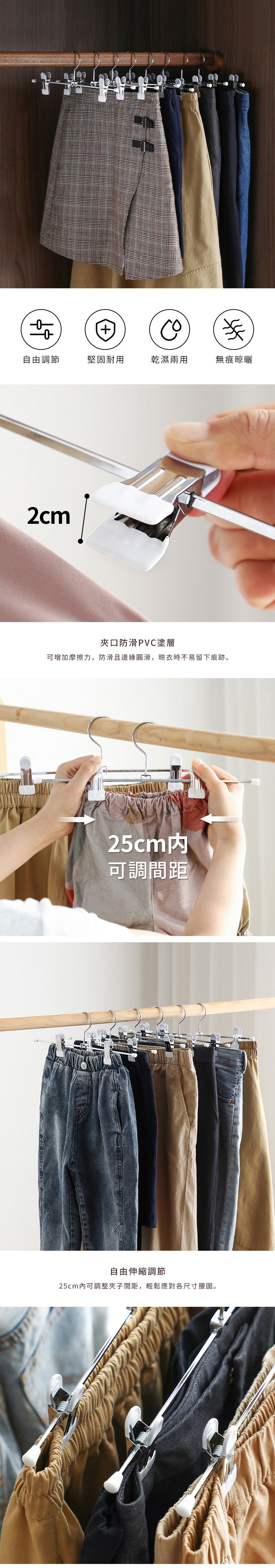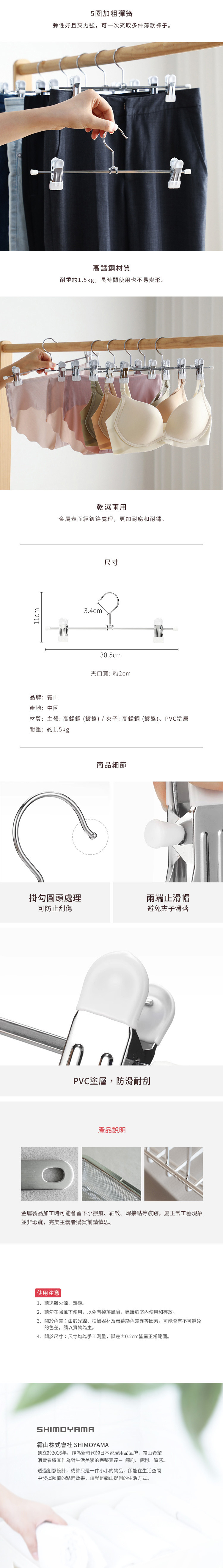 尺寸:長30.5×高11cm、[夾口寬]約2cm、[掛勾口]3.4cm 材質:[主體、夾子]高錳鋼(鍍鉻)、PVC塗層 耐重:1.5kg 產地:中國 ※尺寸皆為人工測量,誤差±0.2cm屬正常範圍。
