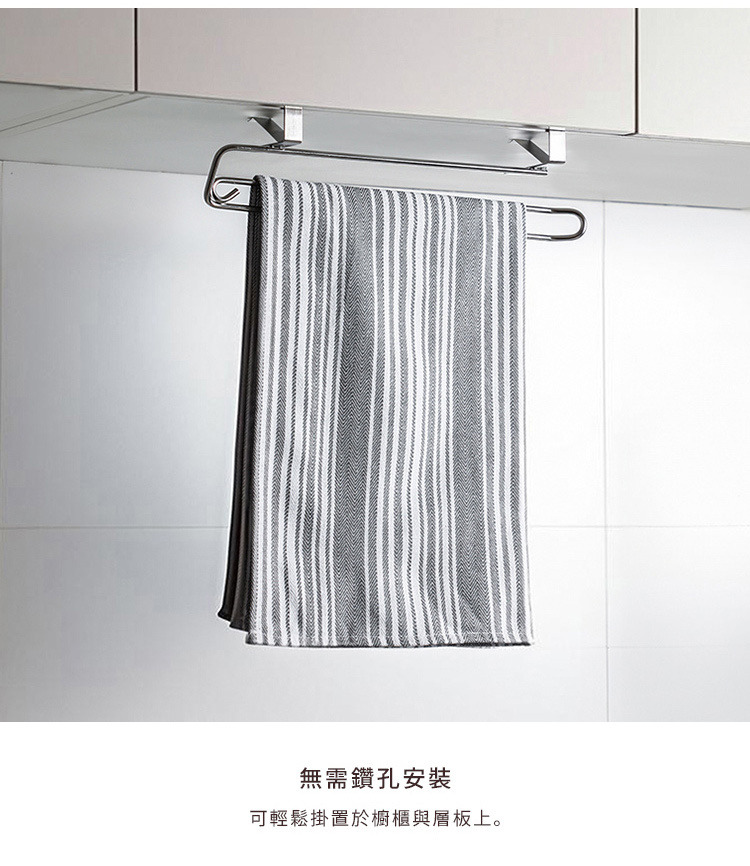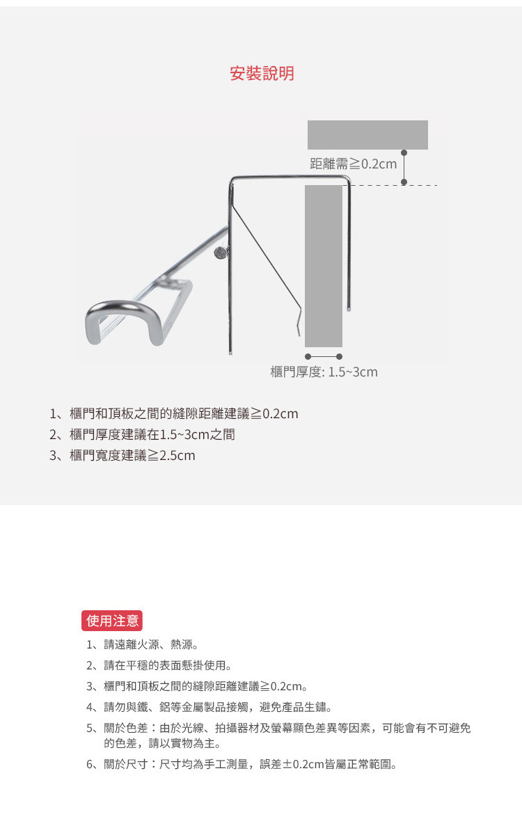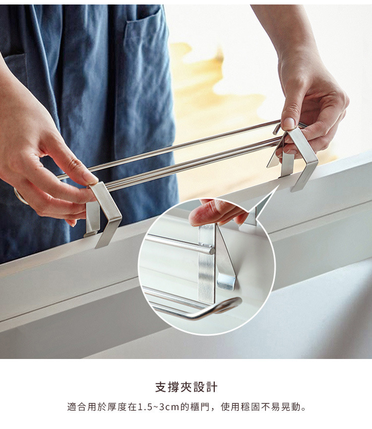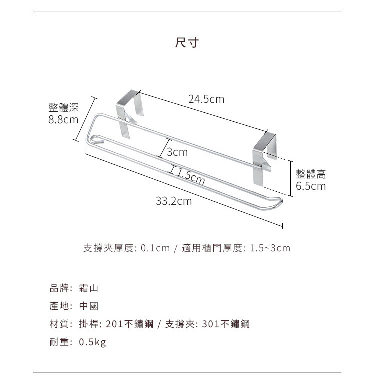 尺寸:寬33.2×深8.8×高6.5cm、[支撐夾]厚0.1cm 材質:[掛桿]201不鏽鋼、[支撐夾]301不鏽鋼 耐重:0.5kg 產地:中國 ※尺寸皆為人工測量,誤差±0.2cm屬正常範圍。