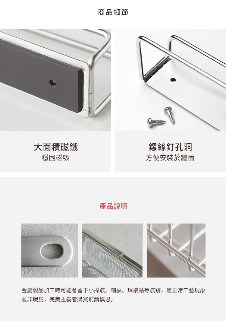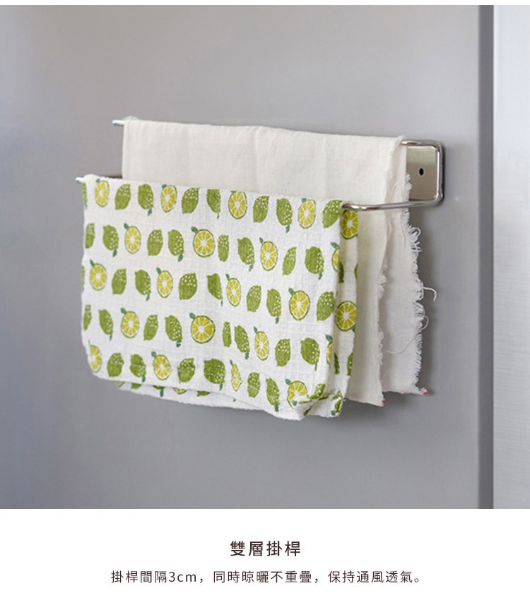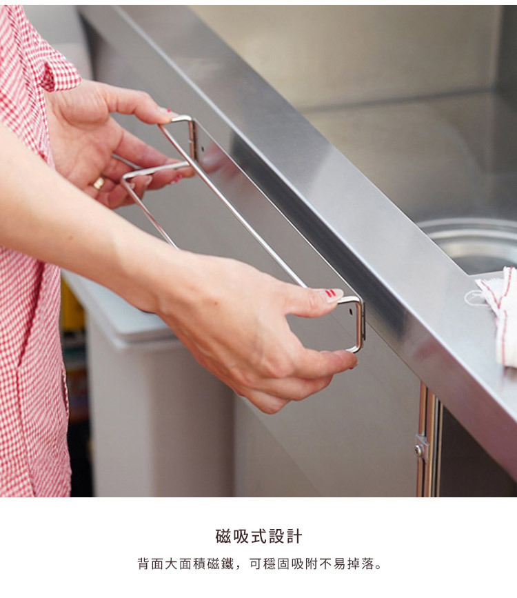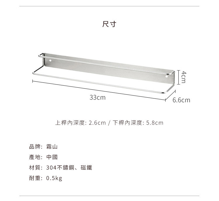 尺寸:寬33×深6.6×高4cm、[上桿內深]2.6cm、[下桿內深]5.8cm 材質:304不鏽鋼、磁鐵 耐重:0.5kg 產地:中國 ※尺寸皆為人工測量,誤差±0.2cm屬正常範圍。