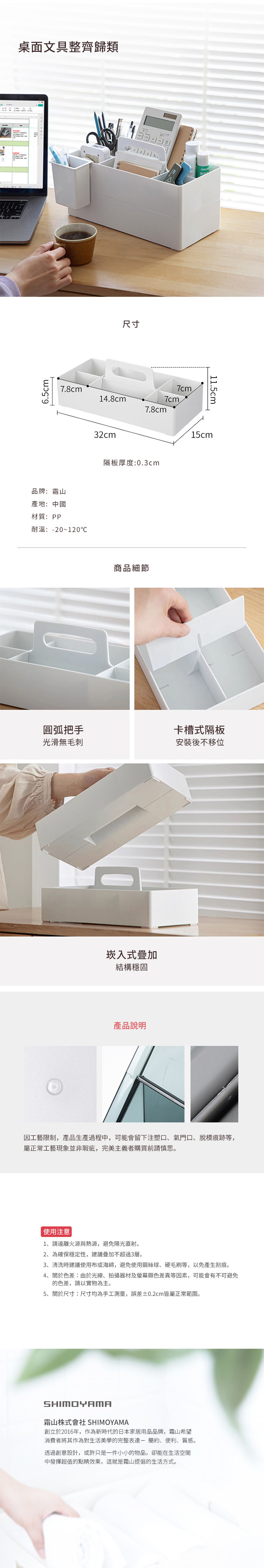 尺寸:寬32×深15×高(含提把)11.5cm、[內尺寸]長7.8×寬7×高6.5cm(4小格)、長14.8×寬7×高6.5cm(2大格)、[隔板厚度]0.3cm 材質:PP 耐溫:-20~120℃ 產地:中國 ※尺寸皆為人工測量,誤差±0.2cm屬正常範圍。