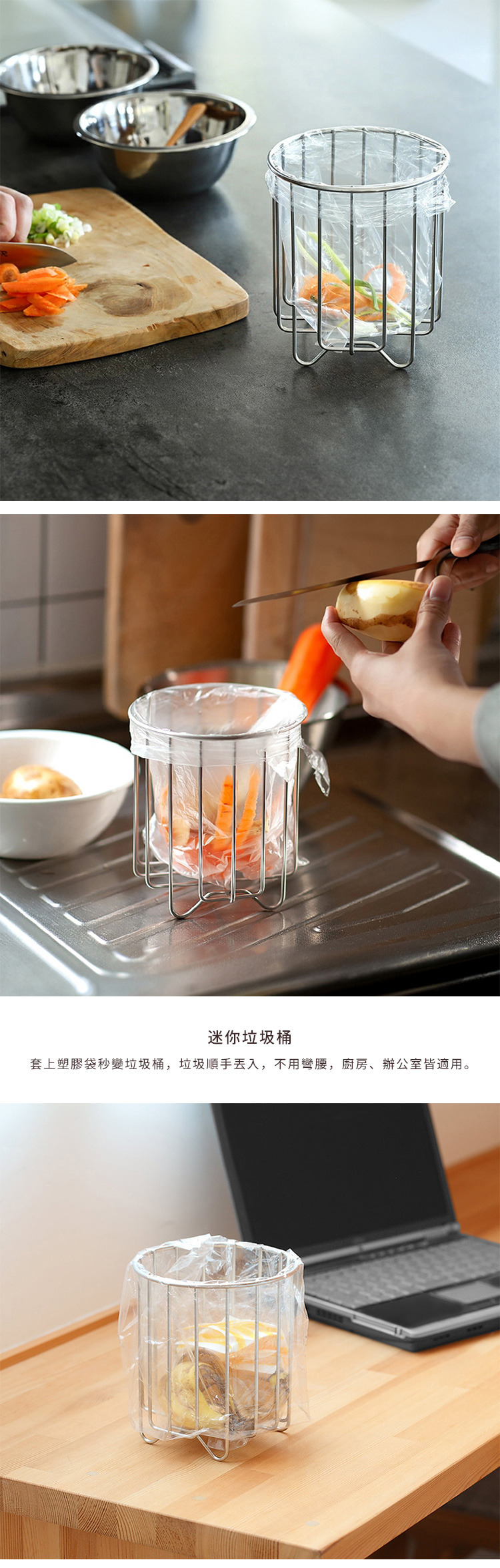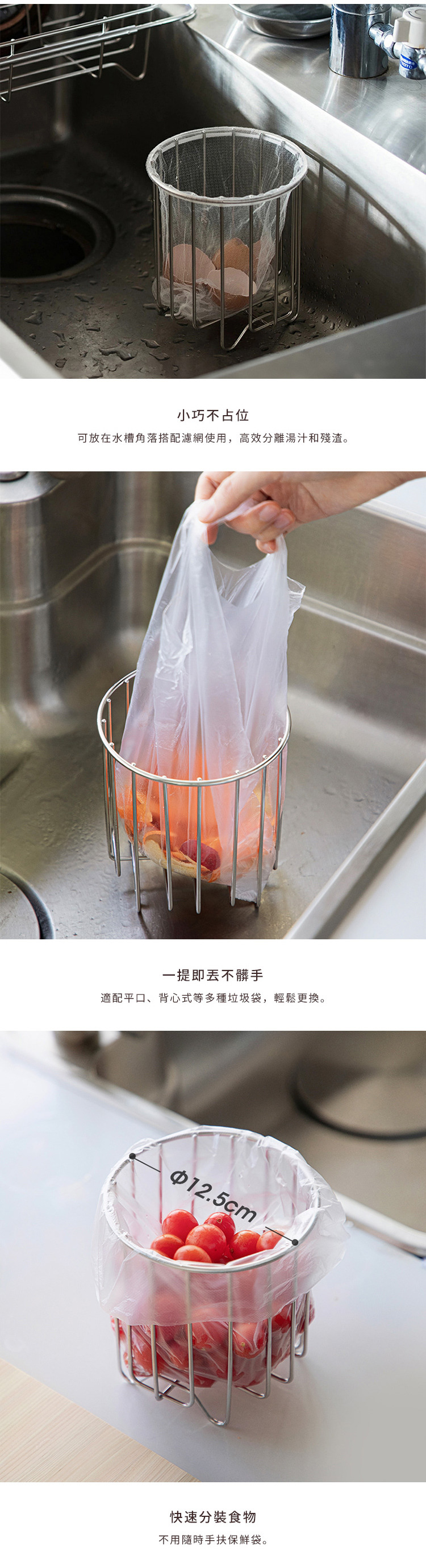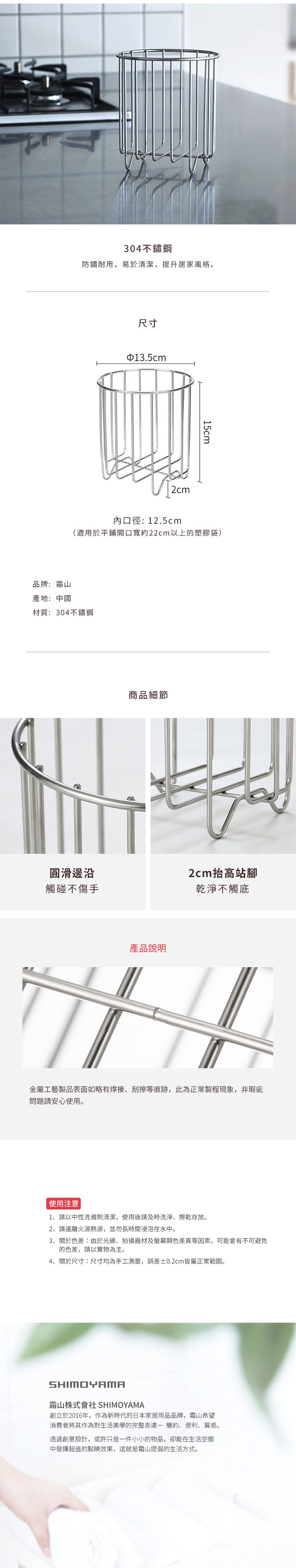 尺寸:直徑13.5×高15cm(含站腳)、[內口徑]12.5cm、[站腳]高2cm 材質:304不鏽鋼 產地:中國 適用於:平鋪開口寬約22cm以上的塑膠袋 ※尺寸皆為人工測量,誤差±0.2cm屬正常範圍。