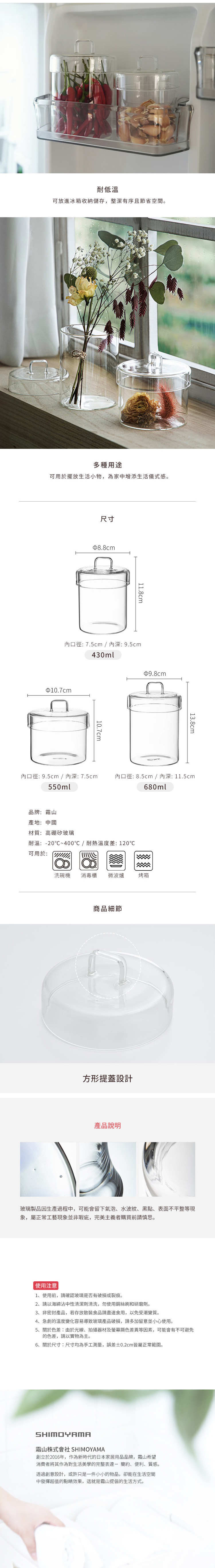 尺寸:直徑10.7×高10.7cm、[內口徑]9.5cm、[內深]7.5cm 材質:高硼矽玻璃 容量:550ml 耐溫:-20℃~400℃、[耐熱溫度差]120℃ 適用於:洗碗機、消毒櫃、微波爐、烤箱 產地:中國 ※尺寸皆為人工測量,誤差±0.2cm屬正常範圍。