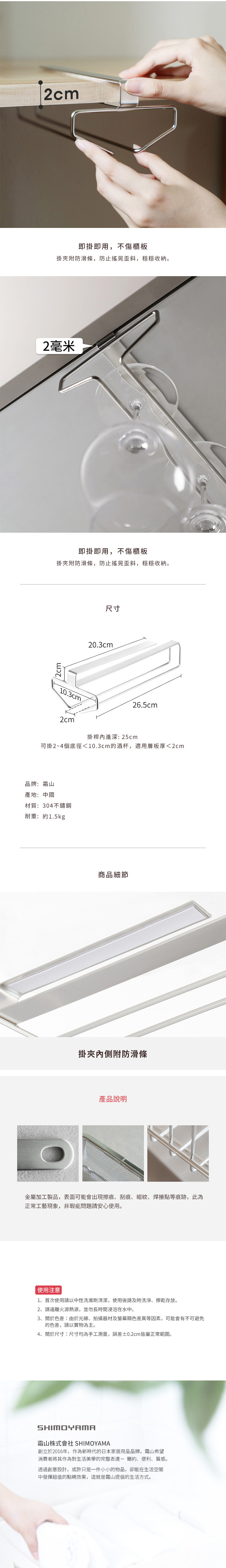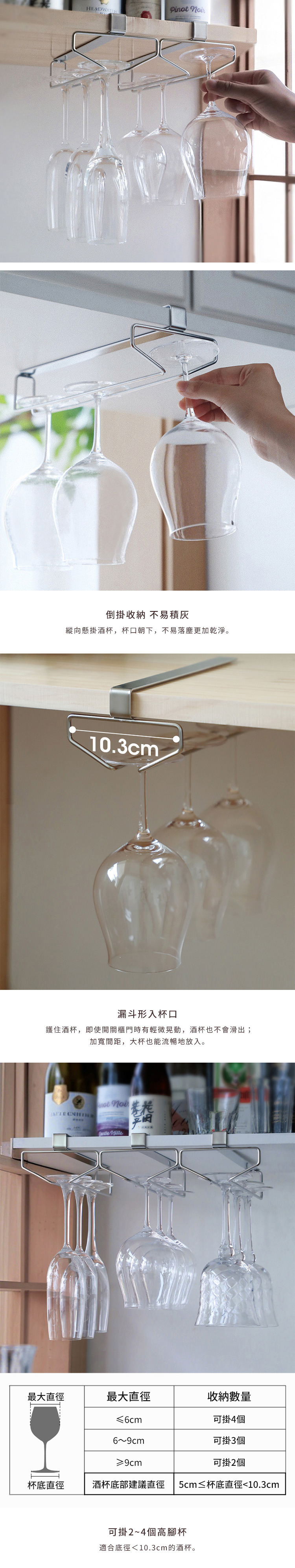 尺寸:寬10.3×深26.5×高7cm、[掛桿內進深]25cm 材質:304不鏽鋼 耐重:約1.5kg 產地:中國 適用酒杯尺寸:5cm≦杯底直徑<10.3cm 適用層板:厚度<2cm ※尺寸皆為人工測量,誤差±0.2cm屬正常範圍。