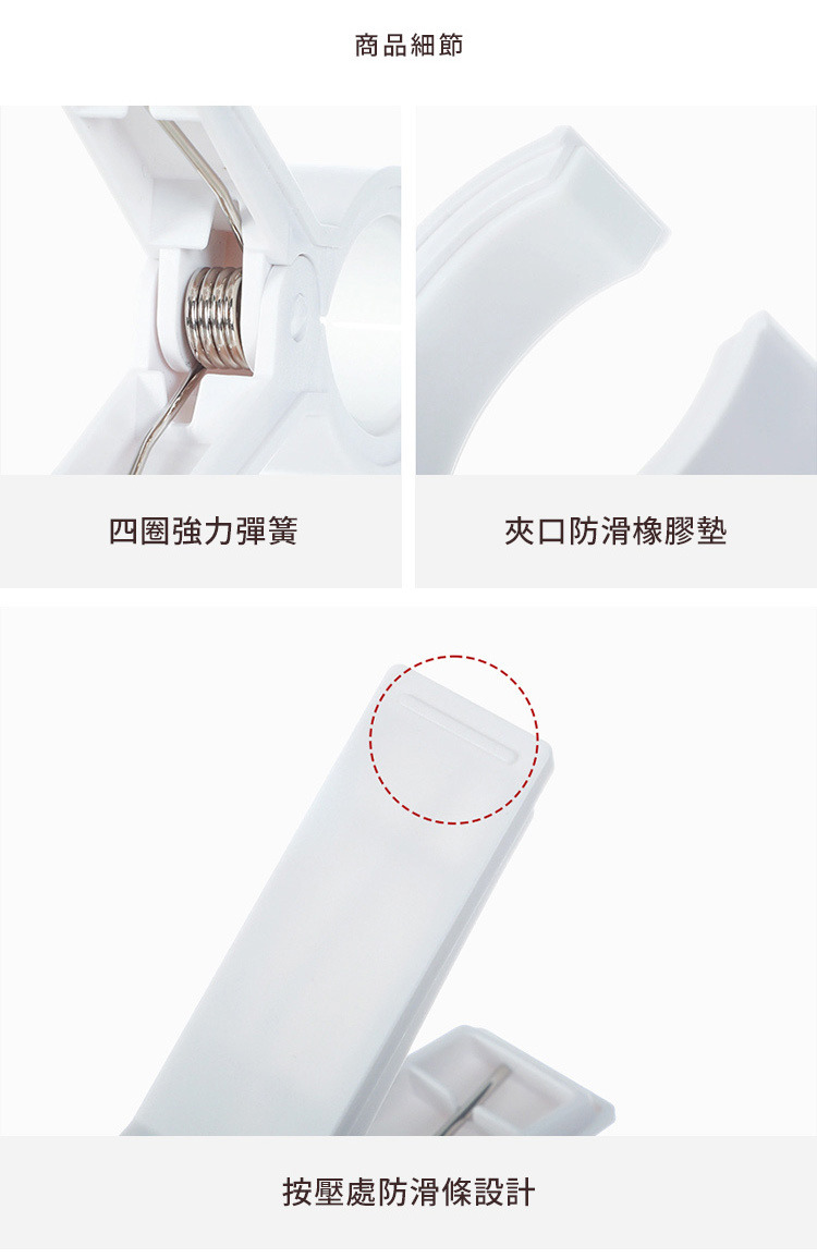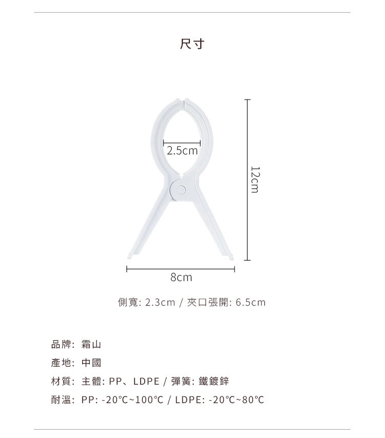 尺寸:長8×側寬2.3×高12cm、[夾口張開]6.5cm 材質:[主體]PP、LDPE、[彈簧]鐵鍍鋅 耐溫:[PP]-20℃~120℃、[LDPE]-20℃~80℃ 產地:中國 ※尺寸皆為人工測量,誤差±0.2cm屬正常範圍。