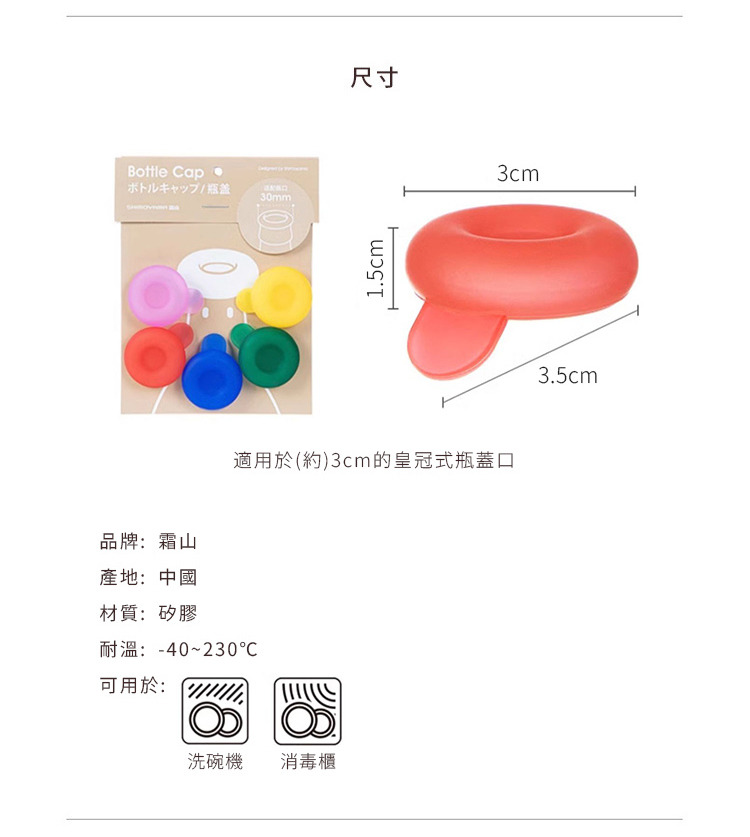 尺寸:長3.5×寬3×高1.5cm 材質:矽膠 耐溫:-40℃~230℃ 適用於:洗碗機、消毒櫃 產地:中國 ※尺寸皆為人工測量,誤差±0.2cm屬正常範圍。