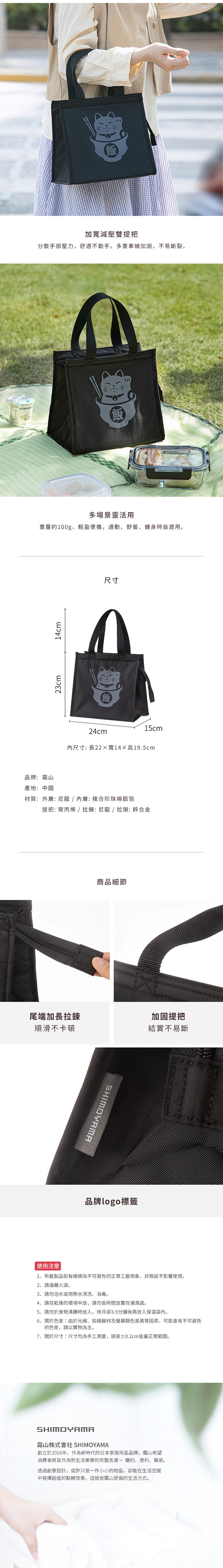 材質:[外層]尼龍、[內層]複合珍珠棉鋁箔、[提把]聚丙烯、[拉鍊]尼龍、[拉頭]鋅合金 尺寸:長24.4×寬15.5×高23cm、[手把立起時]高37cm、[內尺寸]長22×寬14×高19.5cm 產地:中國 ※尺寸皆為人工測量,誤差±0.2cm屬正常範圍
