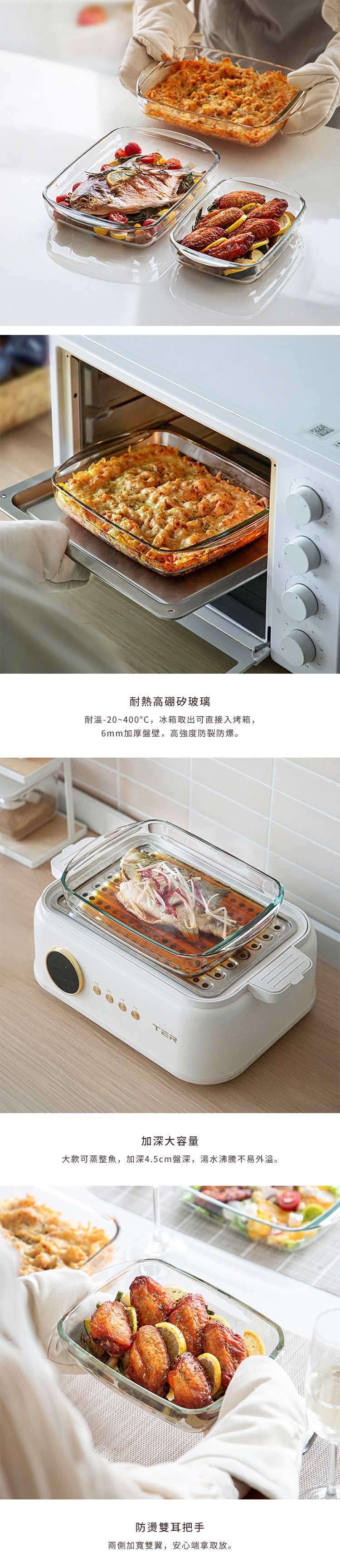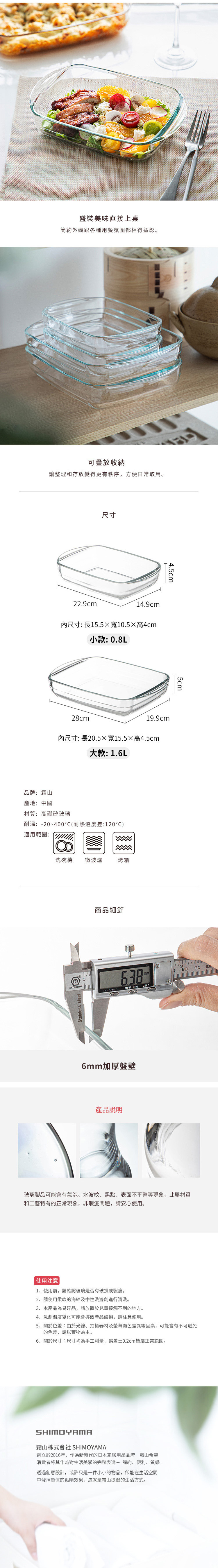 尺寸:長28×寬19.9×高5cm、[內尺寸]長20.5×寬15.5×高4.5cm 材質:高硼矽玻璃 耐溫:-20~400°C(耐熱溫度差120°C) 產地:中國 適用於:洗碗機、微波爐、烤箱 ※尺寸皆為人工測量,誤差±0.2cm屬正常範圍。