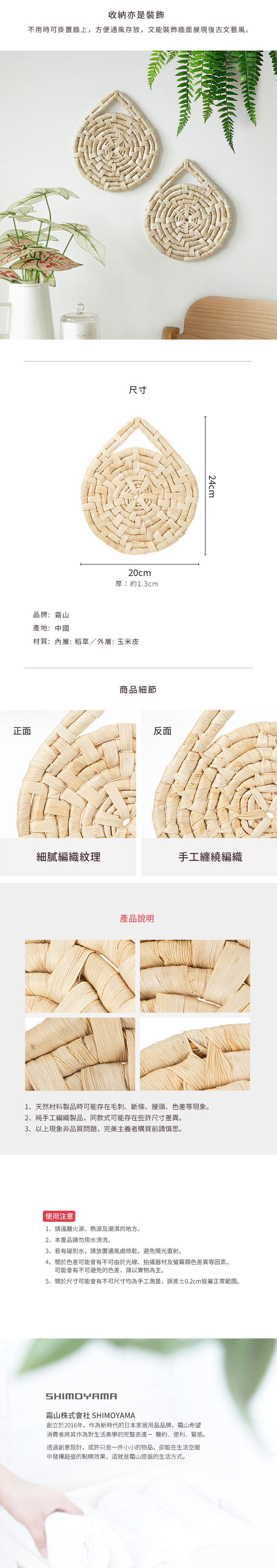 尺寸:長24×寬20×厚1.3cm 材質:[外層]玉米皮、[內層]稻草 產地:中國 ※尺寸皆為人工測量,誤差±0.2cm屬正常範圍。