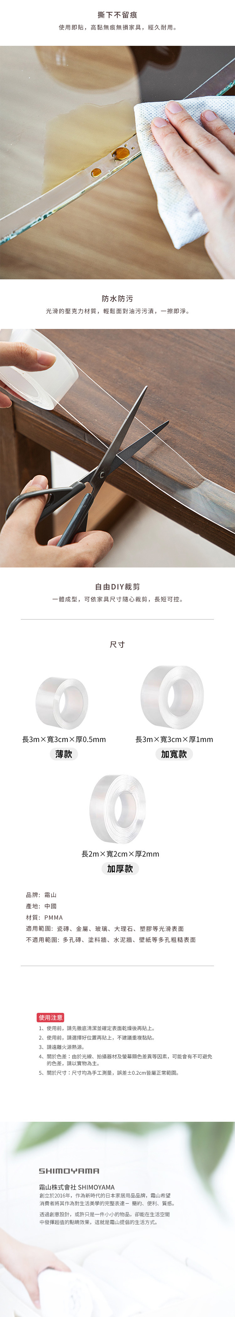尺寸:全長3m×寬3cm×厚0.5mm 材質:PMMA 產地:中國 適用於:瓷磚、金屬、玻璃、大理石、塑膠等光滑表面 不可用於:多孔磚、塗料牆、水泥牆、壁紙等多孔粗糙表面 ※尺寸皆為人工測量,誤差±0.2cm屬正常範圍。