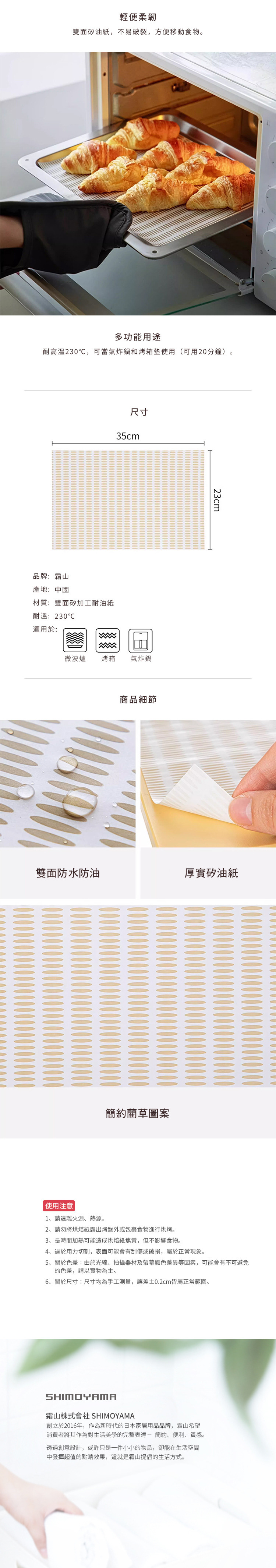 尺寸:長35×寬23cm 材質:雙面矽加工耐油紙 耐溫:230℃ 產地:中國 適用於:微波爐、烤箱、氣炸鍋 ※尺寸皆為人工測量,誤差±0.2cm屬正常範圍。