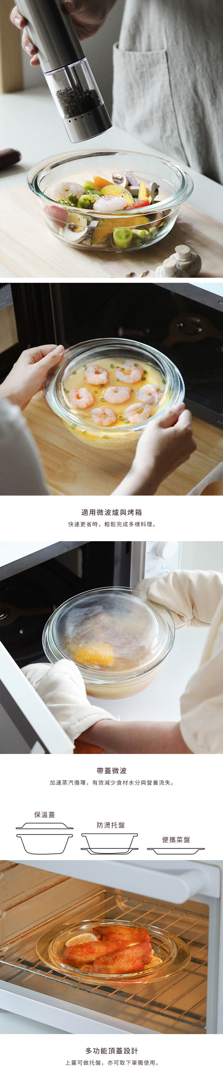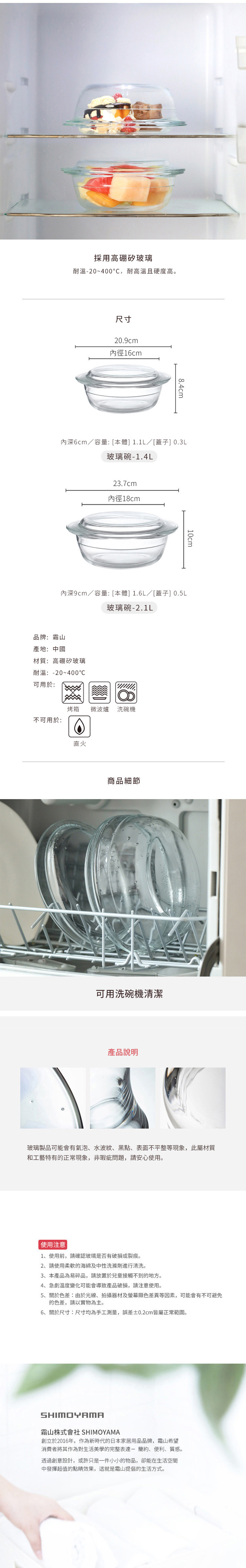 尺寸:寬20.9x高8.4cm、[內徑]16cm、[內深]6cm 材質:高硼矽玻璃 容量:[主體]1.1L、[蓋子]0.3L 耐溫:-20~400℃ 產地:中國 可用於:烤箱、微波爐、洗碗機 不可用於:直火 ※尺寸皆為人工測量,誤差±0.2cm屬正常範圍。