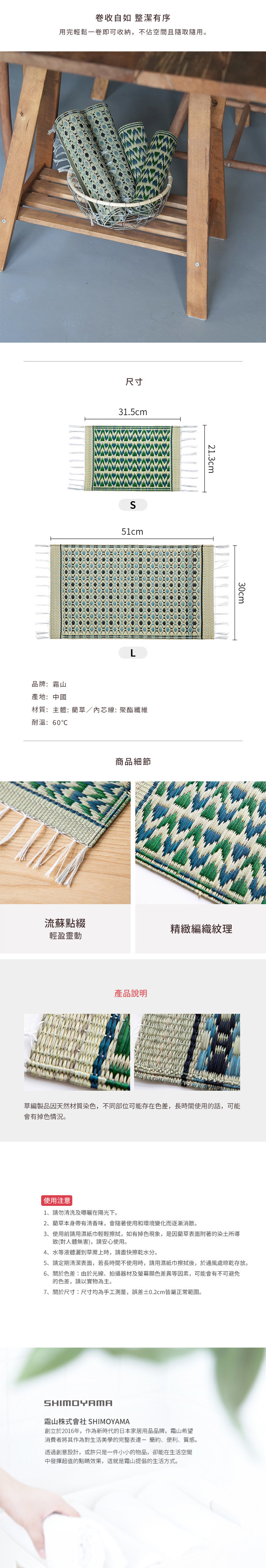 尺寸:長31.5×寬21.3cm 材質:[主體]藺草、[內芯線]聚酯纖維 耐溫:60℃ 產地:中國 ※尺寸皆為人工測量,誤差±0.2cm屬正常範圍。