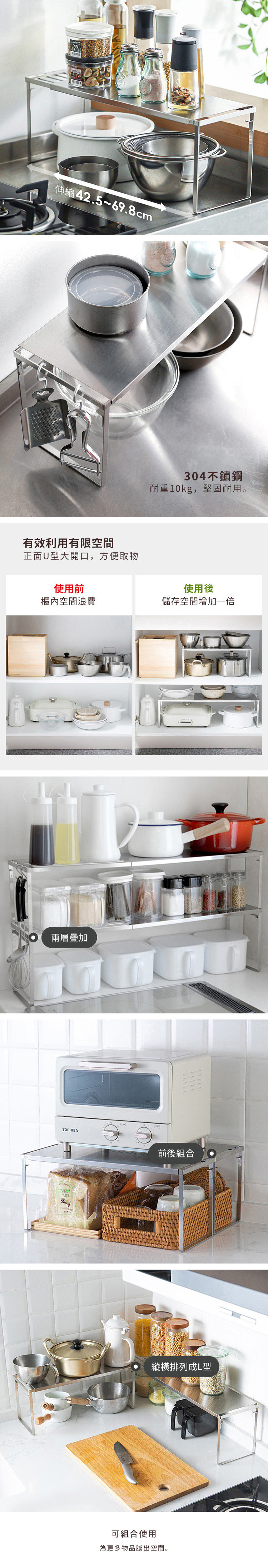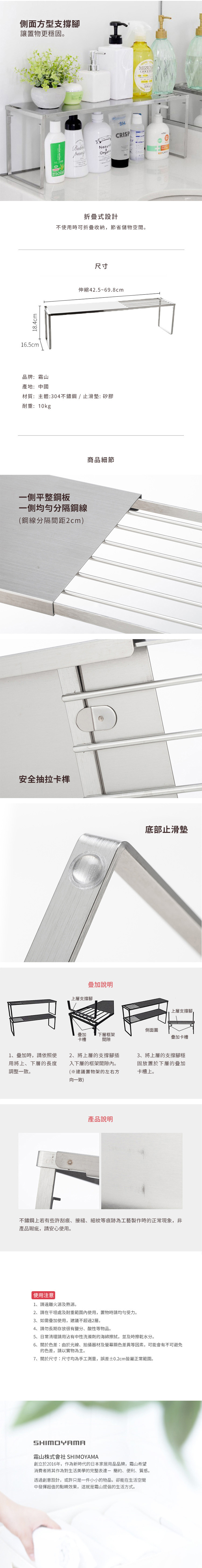 尺寸:長42.5~69.8×寬16.5×高18.4cm(長度可伸縮) 材質:[主體]304不鏽鋼、[止滑墊]矽膠 耐重:10kg 產地:中國 ※尺寸皆為人工測量,誤差±0.2cm屬正常範圍