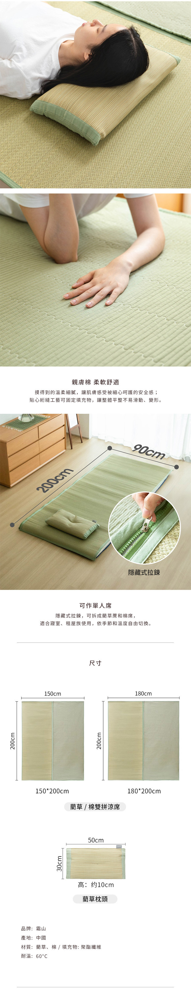 尺寸:長200×寬150cm 材質:[主體]藺草、棉、[填充物]聚酯纖維 耐溫:60°C 產地:中國 ※尺寸皆為人工測量,誤差±0.2cm屬正常範圍。