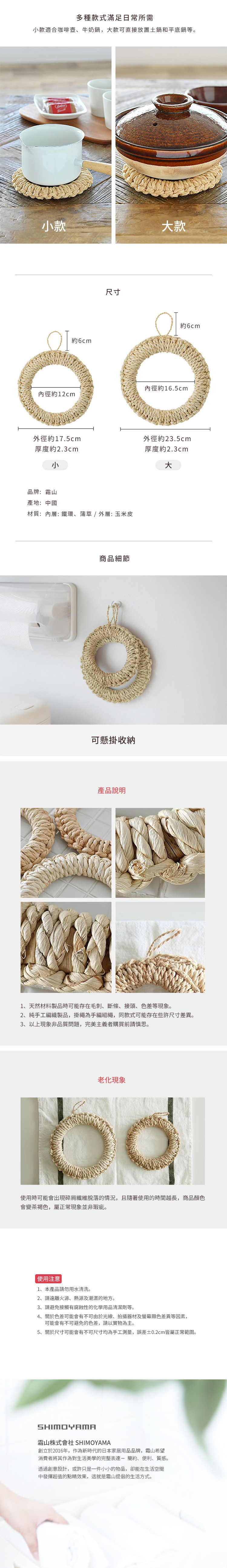 尺寸:[外徑]長17.5×厚2.3cm、[內徑]長12cm 材質:[內層]鐵環、蒲草、[外層]玉米皮 產地:中國 ※尺寸皆為人工測量,誤差±0.2cm屬正常範圍。